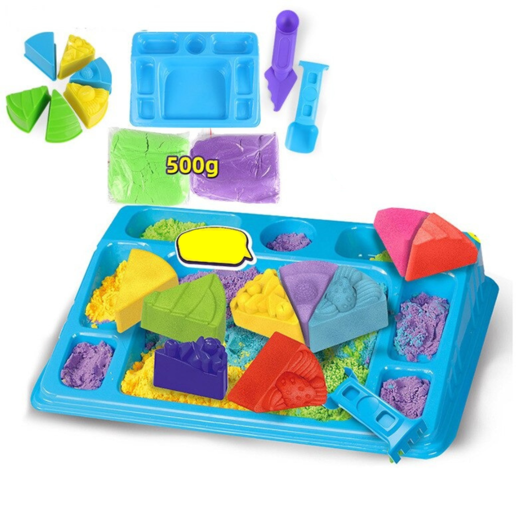 Ten zestaw rozwija małą motorykę i koordynację wzrokowo-ruchową. Wysokiej jakości piasek przykleja się do siebie, a nie do rąk, i jest dostarczany z foremkami tematycznymi, narzędziami i tacką do zabawy. Uspokajająca i edukacyjna zabawka dla dzieci w wieku od 3 lat.