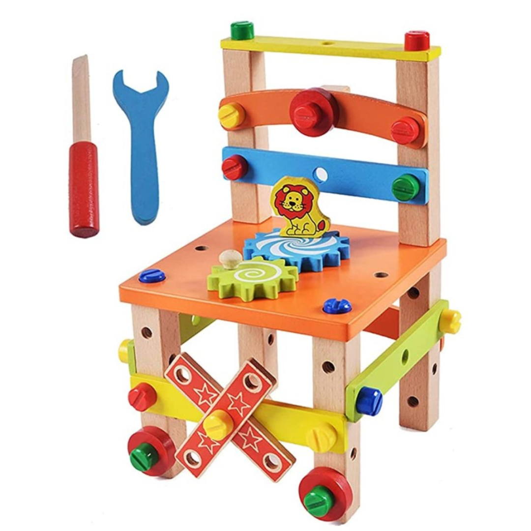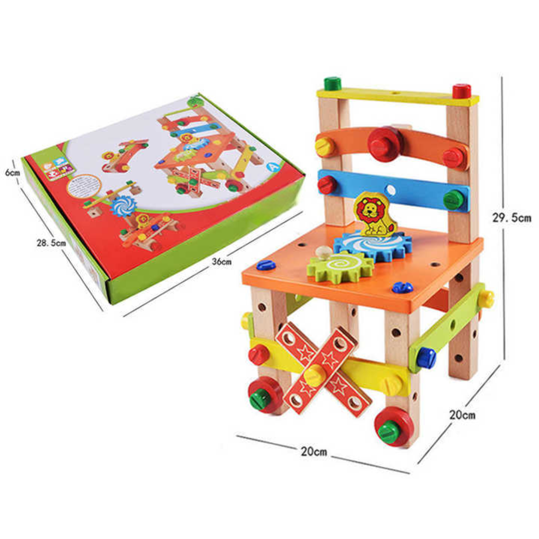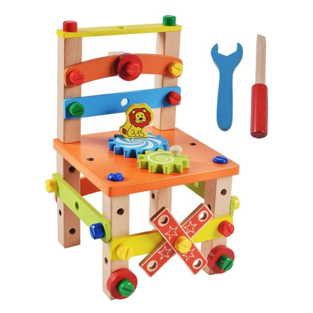 Wykonane z wysokiej jakości drewna liściastego, każde narzędzie i element krzesełka mają polerowane krawędzie i są pokryte nietoksyczną farbą na bazie wody, co zapewnia trwałość, łatwość montażu/demontażu i delikatność dla dłoni dziecka. Liczne narzędzia i elementy sprawiają, że zabawka idealnie nadaje się do wspólnych zabaw, podczas których dziecko może nauczyć się cennych umiejętności społecznych, takich jak dzielenie się, praca zespołowa, cierpliwość i przywództwo, budując i przebudowując różne przedmioty i konstrukcje.