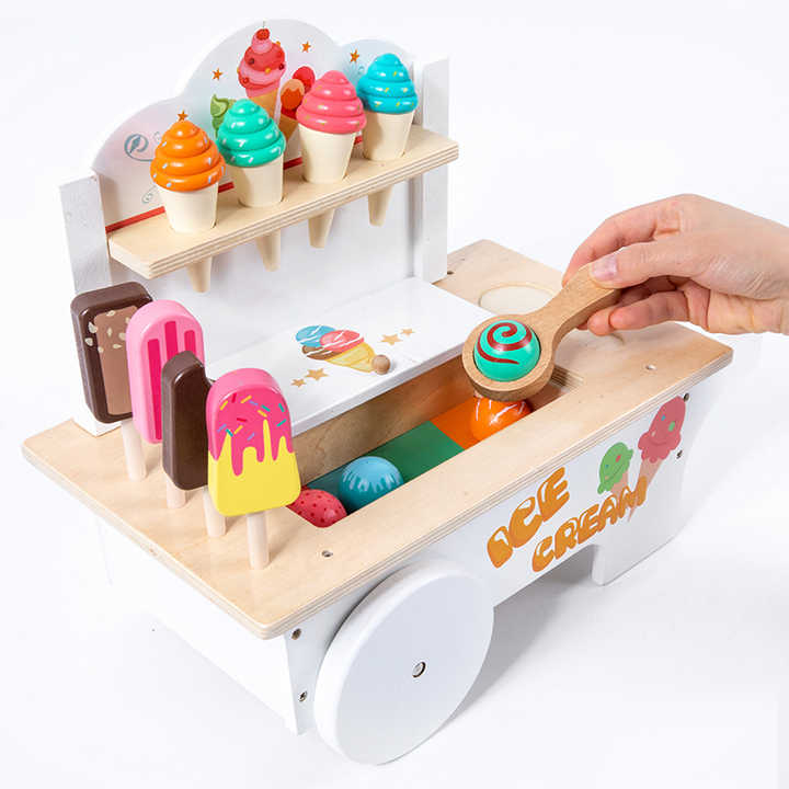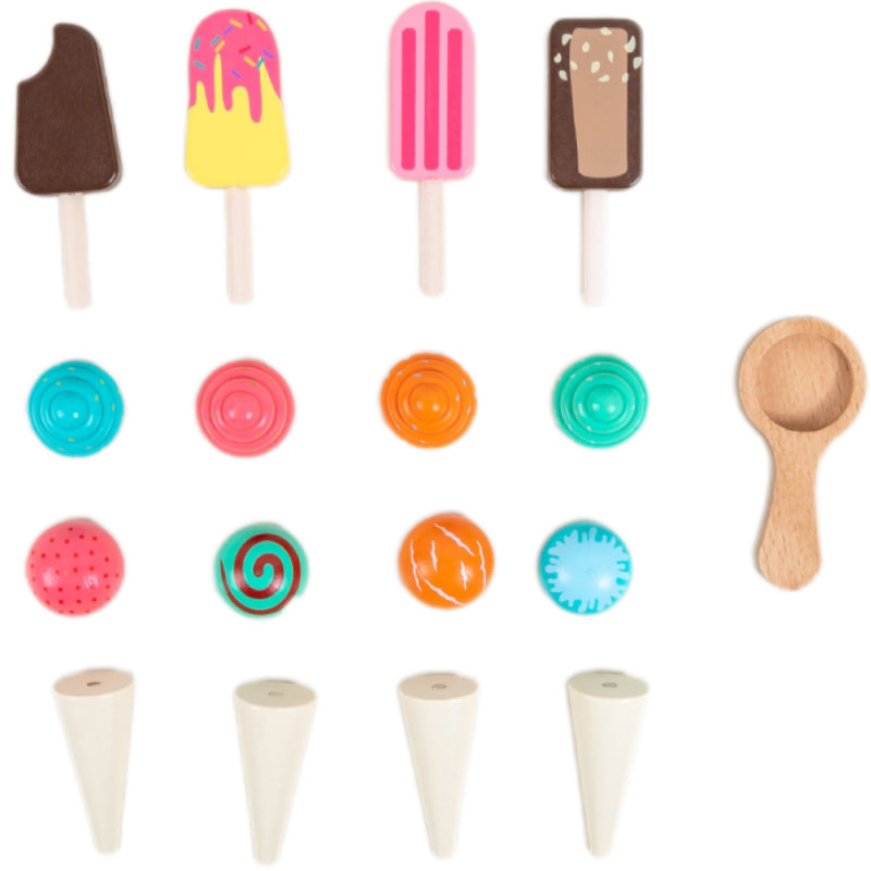 Deze houten ijskar biedt eindeloze mogelijkheden voor kinderen vanaf 3 jaar om hun favoriete ijsjes te serveren. Spelenderwijs leren ze tellen, combineren en samen spelen. Ideaal voor zowel solo- als groepsspel.